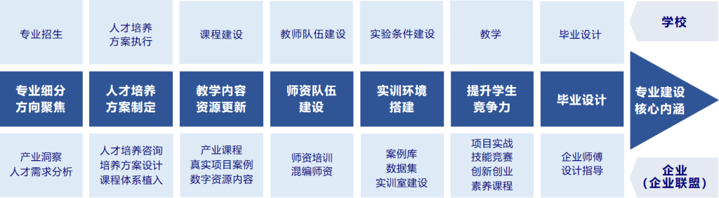 | 全过程深度参与 | 深度参与院校专业群顶层设计、人才方案制定、教学共研、课程建设、赛事组织与就业服务全过程 |