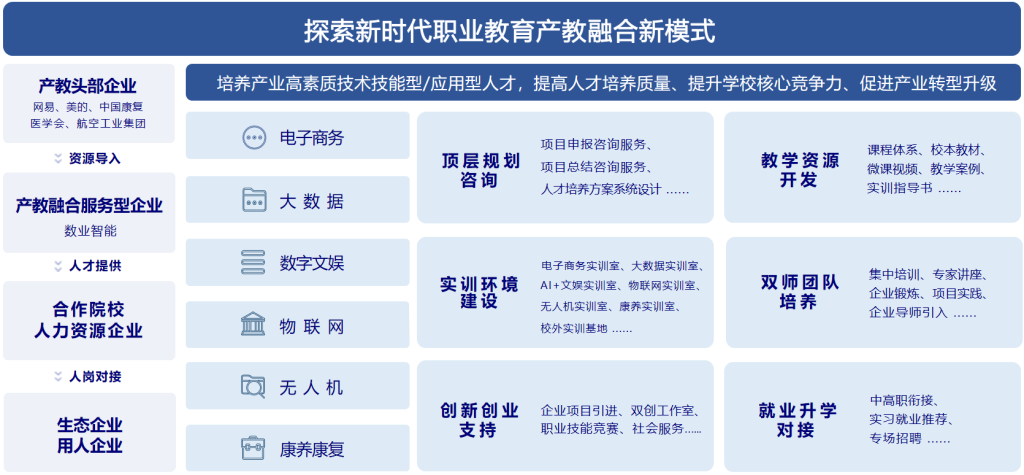 | 企业产业联盟 | 引入上下游产业链资源,打通课程—项目—实训—就业全链条,打造产业型育人生态系统 |